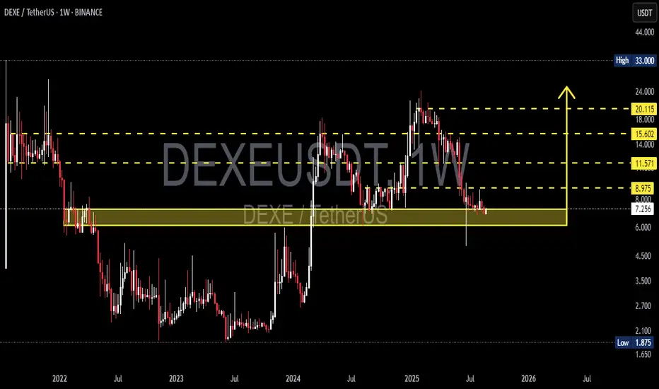 DEXE/USDT is currently retesting the weekly demand zone ($6–8) which has historically acted as a strong accumulation area during 2022–2023. After a massive rally in 2024 followed by a strong correction in early 2025, price has formed a series of lower highs, showing clear selling pressure from smart money.