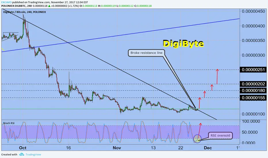 Long time DGBBTC went down. Today i open this chart and i see broken resistance line. Good potential to make good % profit. Buy in bottom