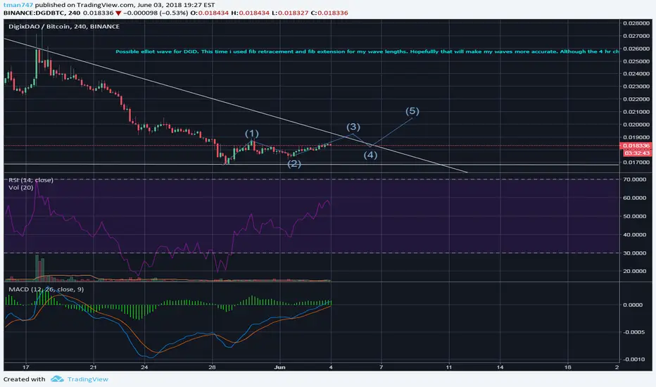 Possible elliot wave for DGD. This time i used fib retracement and fib extension for my wave lengths. Hopefully that will make my waves more accurate. Although the 4 hr chart does looks bearish in my opinion, the 1 day chart looks more promising with Low RSI and histogram pointing upwards.