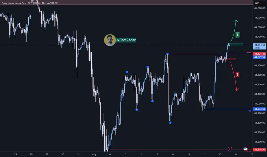 The index is currently trading near the 44,600 level, which is considered a potential reversal zone. The possible scenarios are as follows: