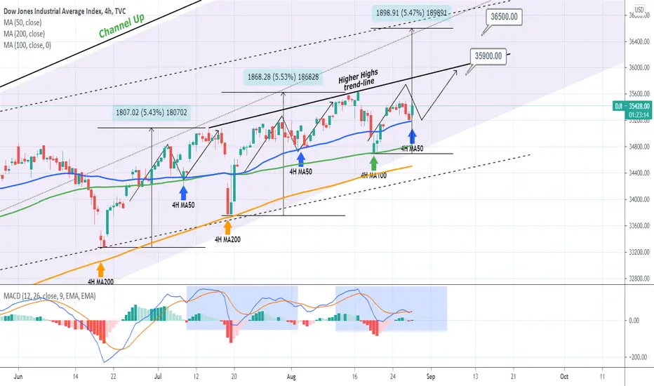 Target: 35900 lower risk (just below the Higher Highs trend-line) or 36500 higher risk (a roughly +5.50% extension top from the MA100 low).