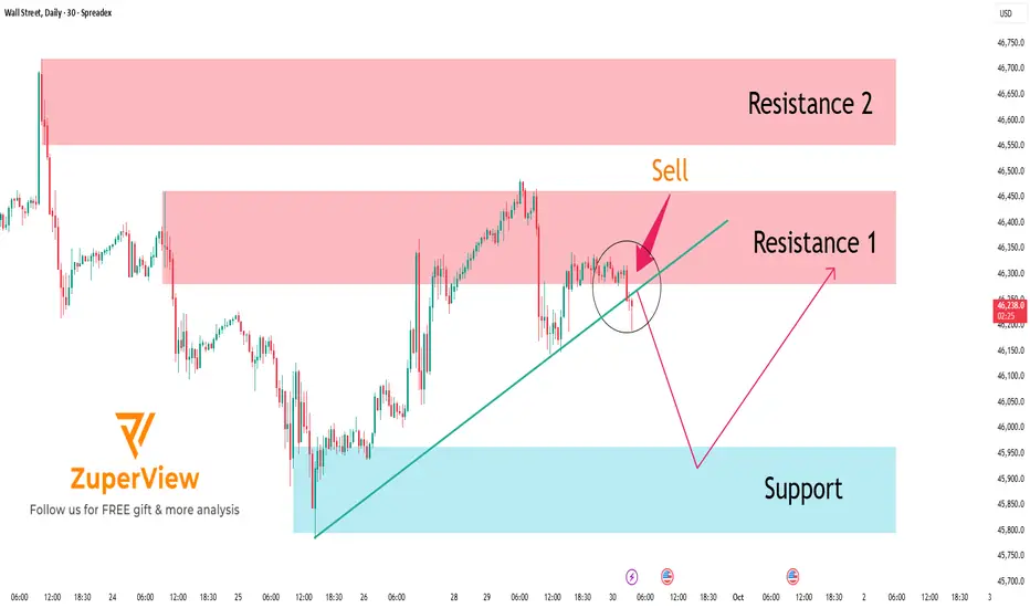 US30 is under visible selling pressure after rejecting Resistance 1 and reacting strongly at multiple confluence levels. The technical setup favors a trend-following short strategy, with proper risk management and patience around key levels to confirm next moves.