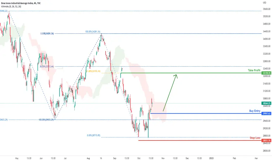 According to the H4 chart, the current overall bias for DJI is bearish. However, because the CPI figure came in higher than projected, the short-term trend is expected to be positive bullish. Looking for a buy entry retracement at 29997.62, which comprises the 23.6% Fibonacci line and the market gap. To avoid missing out on the trade, entry will be at the peak of the market gap. The stop loss will be at 28551.76, which is slightly lower than the previous low and also the location of the 0% Fibonacci line. The take profit point will be at 32170.35, which is the intersection of the 61.8% and 38.2% Fibonacci lines and the market gap.
