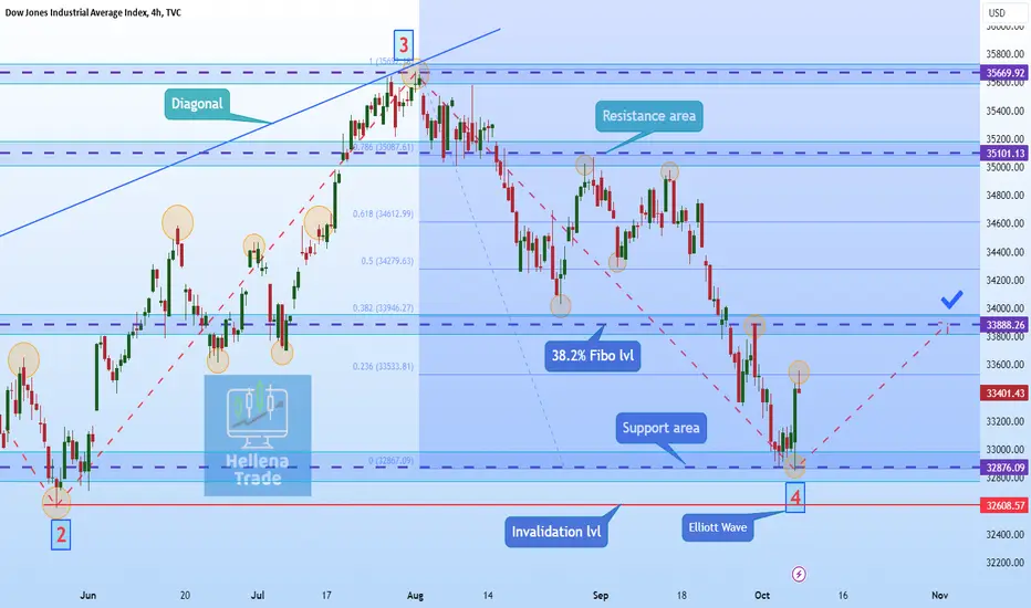 Hellena | DJI (4H): Long to 38.2% Fibonacci level 33888.