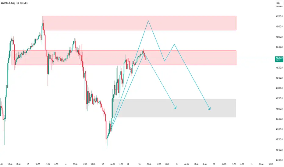 After a strong rally from the lower demand zone, the Wall Street Index is now approaching a key supply area that previously triggered a sharp downward move.
