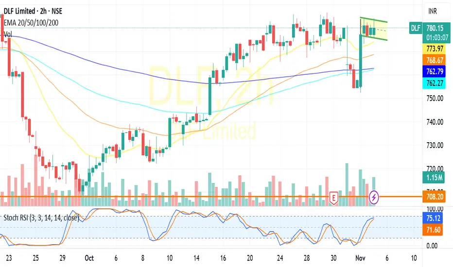 DLF: Has formed a flag pattern in 2 hrly chart.as per the pattern the likley target is 800+(for educational purpose only)