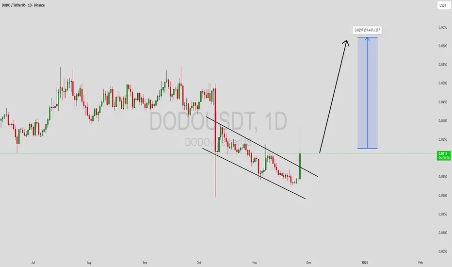 DODOUSDT is forming a clear falling wedge pattern, a classic bullish reversal signal that often indicates an upcoming breakout. The price has been consolidating within a narrowing range, suggesting that selling pressure is weakening while buyers are beginning to regain control. With consistent volume confirming accumulation at lower levels, the setup hints at a potential bullish breakout soon. The projected move could lead to an impressive gain of around 80% to 90% once the price breaks above the wedge resistance.