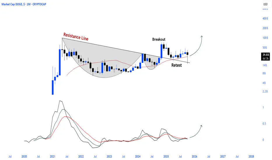On Dogecoin market cap chart, the cup-handle formation broke through the resistance level, successfully completing the retest.