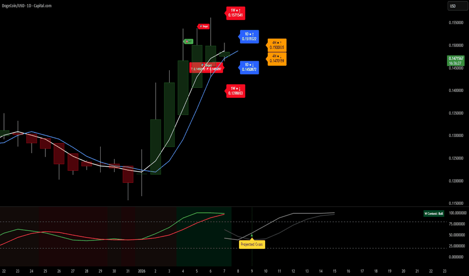 DOGE / USD — Momentum Reversal This chart illustrates a momentum-driven trend reversal in DOGE/USD following a prolonged corrective phase. Price has transitioned from compression into expansion, supported by improving structure and multi-timeframe alignment.