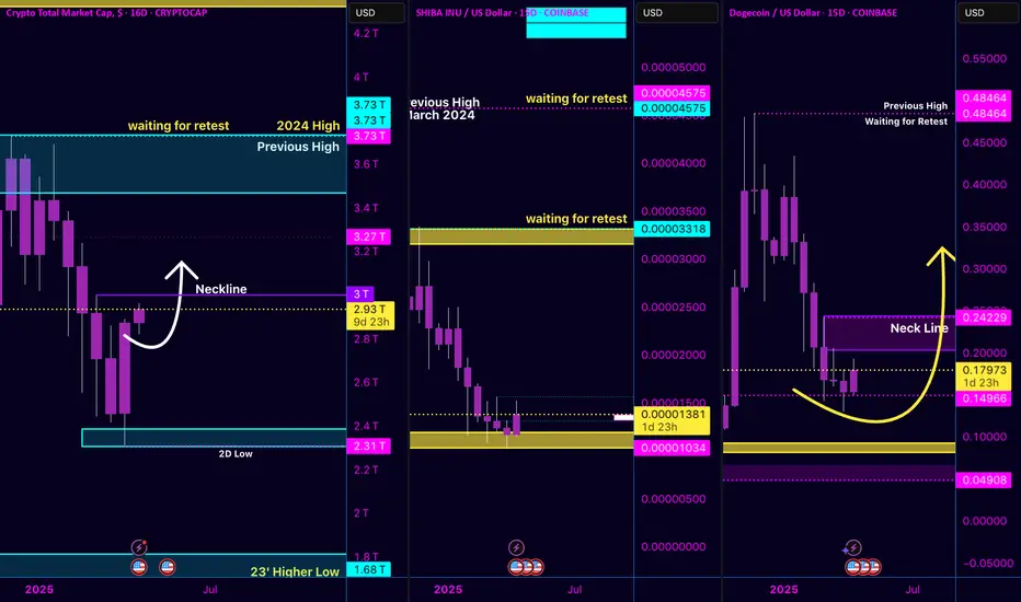 In this chart, you’ll see how SHIB and DOGE are setting up in sync with the Total Cap recovery: