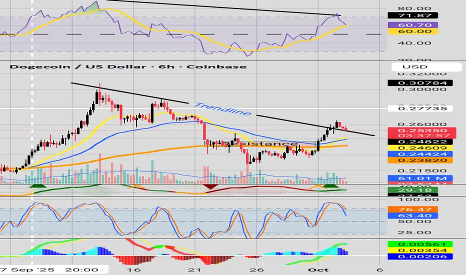 If the trendline serves as support the bulls are good to go. If not price may fall back to the 24 cents range the 21 EMA in yellow.