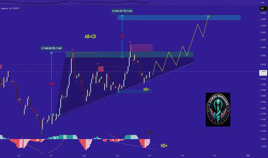 The price on the daily timeframe is within an ascending triangle, which can be promising. If the price breaks this pattern with bullish candles, it could easily rise by the distance of AB=CD, If my view is correct, DOGE will rise to 0.38 .