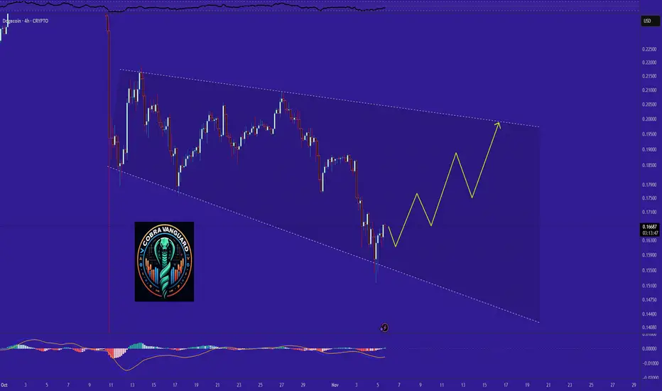 The price could rise from here to the top of the wedge, potentially reaching around $0.20.