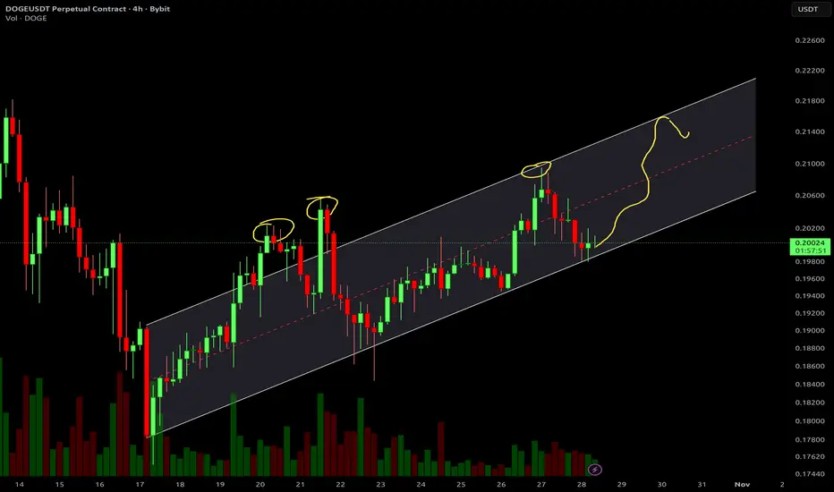 DOGE is in the bottom of an upward channel. It looks ready to re-enter the top of the channel