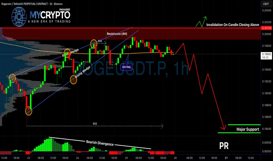 💎DOGEUSDT is currently reacting from a strong 4H resistance zone, which already gives us an early warning of potential rejection. Zooming into the 1H timeframe, price has broken down Rising wedge with bearish divergence. This isn’t just a random move; it's supported by confluence, especially with the 200 EMA acting as dynamic resistance on the 1H. That kind of layered rejection significantly increases the probability of a further bearish continuation.