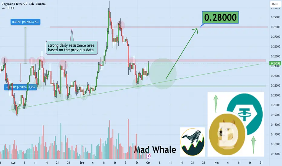DOGEUSDT is testing a strong daily trendline and key support 📉; holding this level could fuel a 15% upside toward the next resistance near 0.28 🚀.