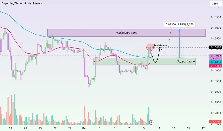 Trading volume on December 9 surged, reflecting active buying and support for the breakout from the accumulation zone around $0.146 to above $0.147. This signals that DOGE has the potential to extend its rally, but attention should be paid to its reaction near the $0.150 resistance level.