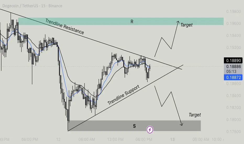 If DOGE breaks above the resistance trendline, expect upside continuation toward 0.195–0.196 USDT. This would confirm a bullish breakout from the symmetrical triangle pattern.