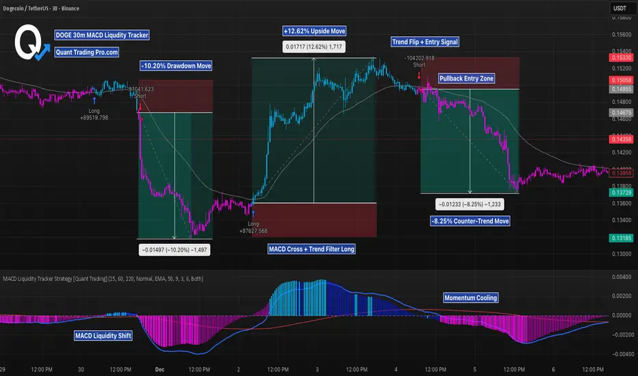 This 30M chart shows how the MACD Liquidity Tracker Strategy behaves during clear trend rotations. The first shift came after a strong liquidity flip on MACD, followed by alignment with the EMA trend filters. That combination produced a clean long signal and a full trend rotation before momentum began to fade.