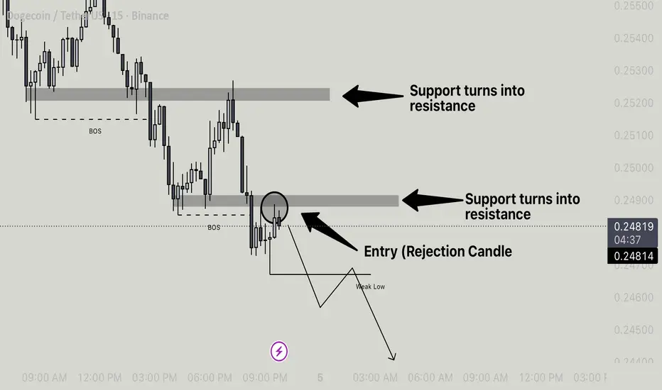 • After the breakdown, that same zone is now acting as resistance (highlighted grey zones).