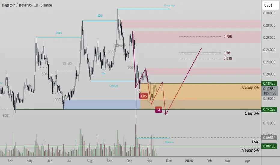 From both a technical and structural perspective, Dogecoin is in the development phase of a reversal pattern that could shift short-term momentum once finalized.