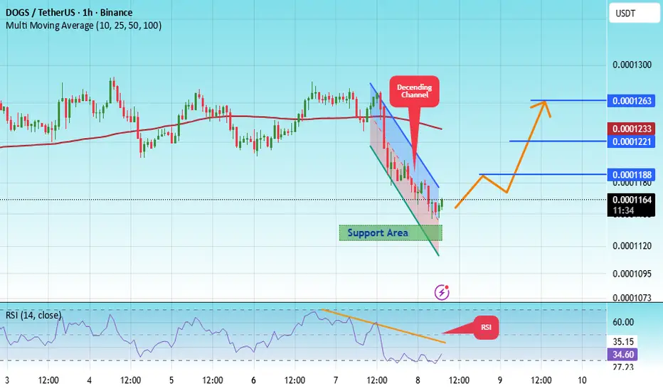 There is a major support area in green at 0.0001130, which represents a strong support point.
