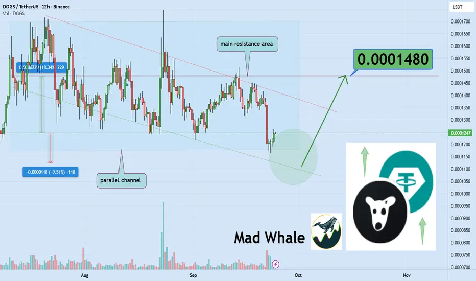DOGS is currently testing the lower boundary of its parallel channel, holding near a key support level 📉. A successful defense here could trigger an estimated 18% rebound, with the next target set around 0.00014 USD 🚀.
