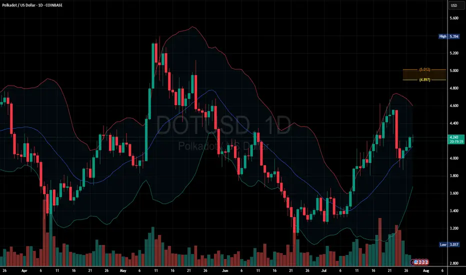 - DOT is trading above the 20-day moving average (middle band of the Bollinger Bands), which is a bullish signal suggesting upward momentum.