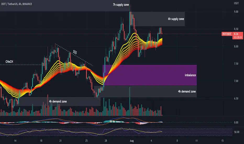 Price is currently close to tapping into the major 6h supply zone at $8.6. MACD is not clear, RSI and EMAs are neutral. We would be looking for shorts once price taps into this area aiming to fill the imbalance around $7.