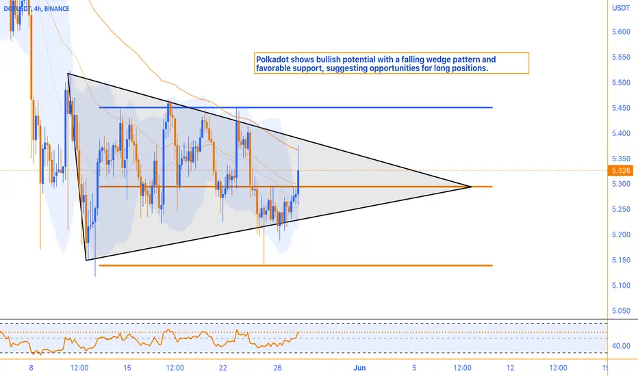 Polkadot is currently being traded within a significant support zone, presenting a favorable trading opportunity. On smaller timeframes, a falling wedge pattern has emerged, indicating the potential for an imminent breakout from this triangular formation. Moreover, the Relative Strength Index (RSI) is currently at the 58 level, suggesting moderate bullish momentum in the stock. This implies that buying pressure is stronger than selling pressure, yet it has not reached an overbought condition. With these factors in mind, traders can consider building a long position at the support level while implementing proper risk management techniques. This analysis indicates a potential upward movement in DOT's price in the near future.