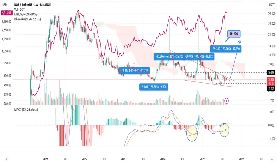 DOT is about to complete a long-term consolidation and bottoming phase on the weekly chart. The $3.5 – $4.0 range is a critical support zone. A strong breakout from this level could bring $7 first, followed by a $16 target. The MACD indicator supports the bullish signal. However, if there is a weekly close below $3.5, the scenario breaks down and new lows may appear.