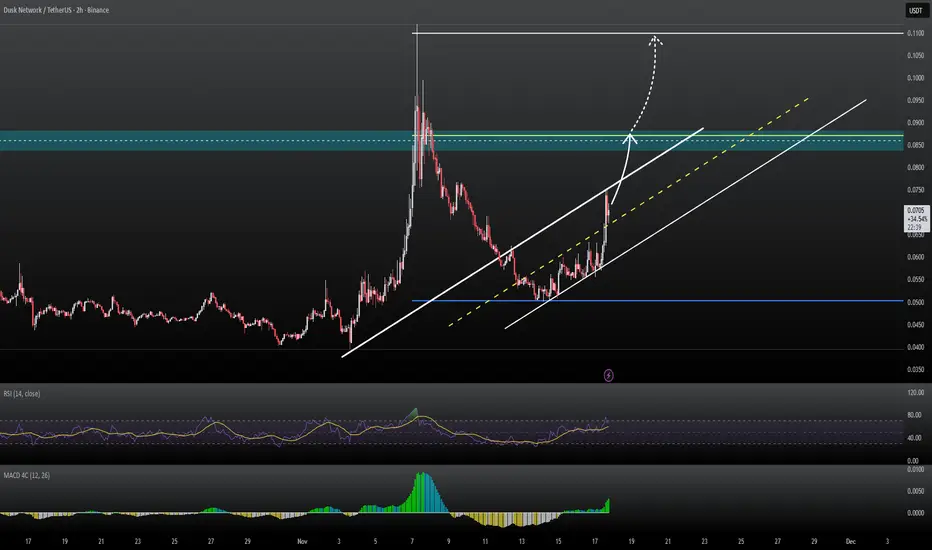 DUSK has successfully bounced from the 0.067–0.069 USDT support zone on the 1H/4H timeframes. The price has reclaimed the local Moving Average, accompanied by strong impulse candles, suggesting a shift in momentum.
