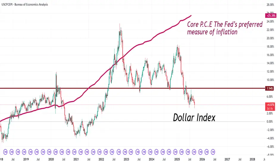 I just wanted us to visualize where Core PCE—the Fed’s preferred measure of inflation—stands, along with the dollar’s situation. It’s not that the dollar is losing its reserve currency status; rather, it’s domestic issues that are driving its decline against other assets. We need to look at the relationship between the spot rate and PCE to anticipate how money market funds will move.
