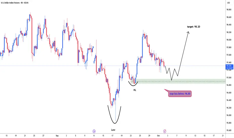 24th September daily strong bullish candle (engulfing candle). price move down with low volume pullback. 96.97-84 daily demand zone for dollar index bullish continuation. if price fails and breaks below 96.45-95.90. stop loss 96.70, target: 98.20