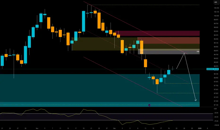 The US Dollar Index continues to trade under structural pressure on the daily chart, following the strong downside impulse that broke November’s value area and pushed price into a key weekly demand zone around 97.90–97.30. After a clear momentum swing lower, the index is now showing early signs of corrective strength, but the broader context continues to favor weakness into year-end.