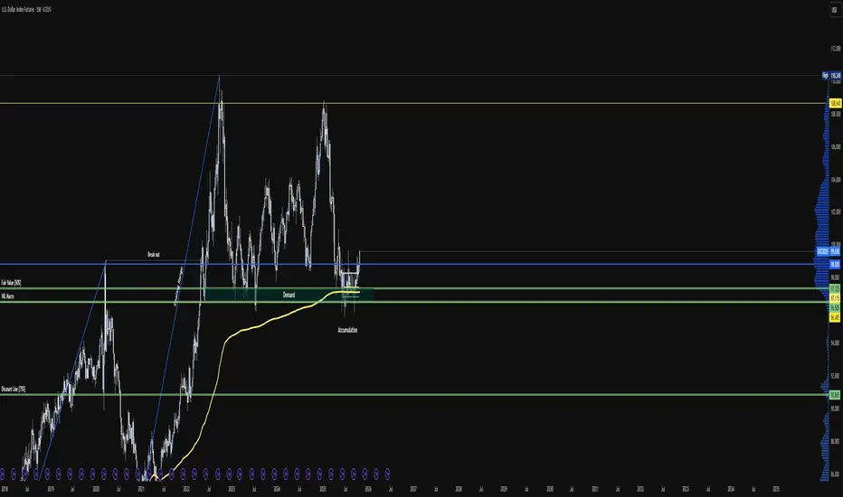 After eight months of sustained weakness in the USD, we now observe a clear phase of accumulation within a macro demand zone, precisely aligned with both the Fair Value (50%) retracement of the previous major dealing range and the macro VAL (Value Area Low).