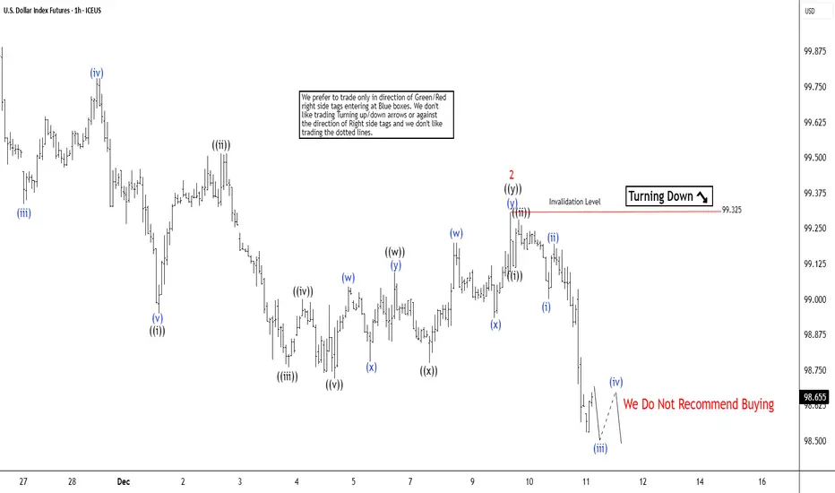 Following this initial decline, the Index staged a corrective advance in wave 2, unfolding as a double three Elliott Wave structure. From the termination of wave 1, wave ((w)) ended at 99.12, while the pullback in wave ((x)) concluded at 98.79. A final push higher in wave ((y)) reached 99.32, completing wave 2 in higher degree. With this correction finished, the Index has resumed its downward trajectory in wave 3. From the wave 2 high, wave ((i)) ended at 99.13, and the rally in wave ((ii)) terminated at 99.3. In the near term, as long as the pivot at 99.32 remains intact, rallies are expected to fail. The decline should continue to unfold in sequences of 3, 7, or 11 swings, reinforcing the bearish outlook and favoring further downside pressure toward the projected Fibonacci target.