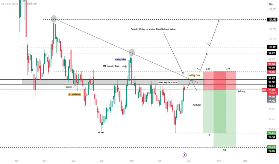We are now watching closely for a liquidity grab within the 98.300–98.880 liquidity zone.