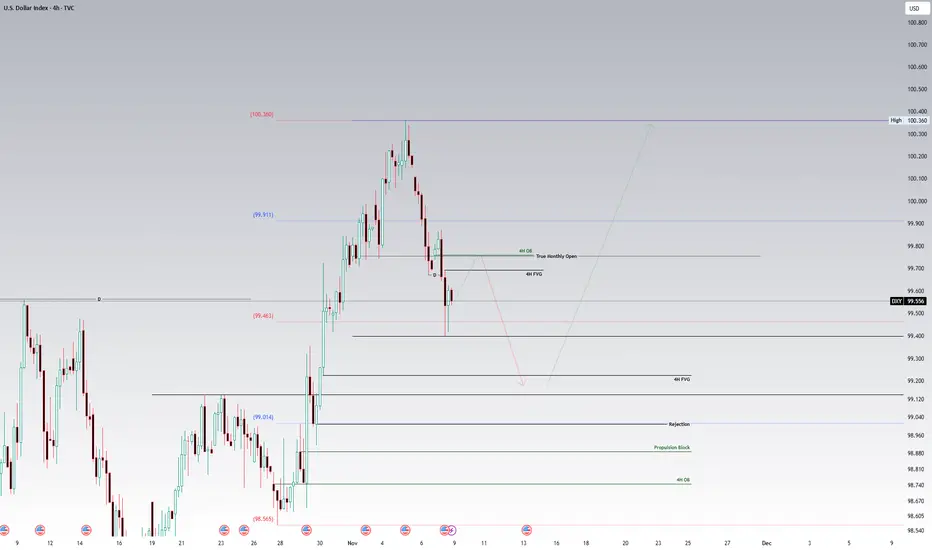 Note the 4H bearish order block aligning with the monthly opening price for November 2025. This adds confluence that price would reach for this bearish 4H order block and lower taking out the low of 99.398 heading into the bullish weekly fair value gap.
