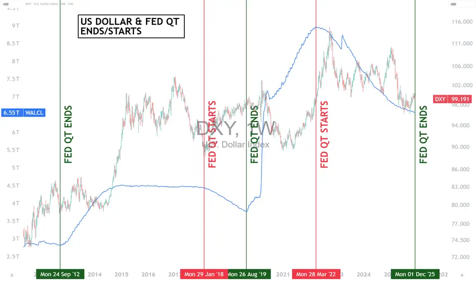 Since Monday, December 1, 2025, the US Federal Reserve (Fed) has officially ended the quantitative tightening cycle initiated in 2022. This decision marks an important turning point in US monetary policy: the balance sheet contraction— which had tightened financial conditions for more than three years—has now come to an end. Historically, changes in the Fed’s balance sheet exert a significant influence on financial markets, particularly on the US dollar index (DXY). However, the end of QT does not carry the same meaning as the start of a quantitative easing (QE) program.