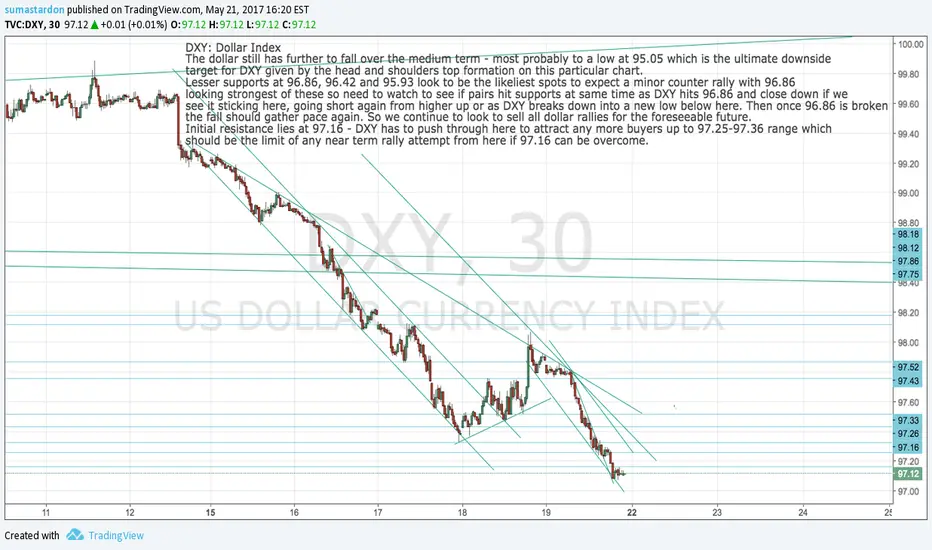 DXY: DOLLAR index This index should fall to 95.05 which is the target created by the head and shoulders on DXY chart - best defence is to continue to sell all dollar rallies until target is achieved.