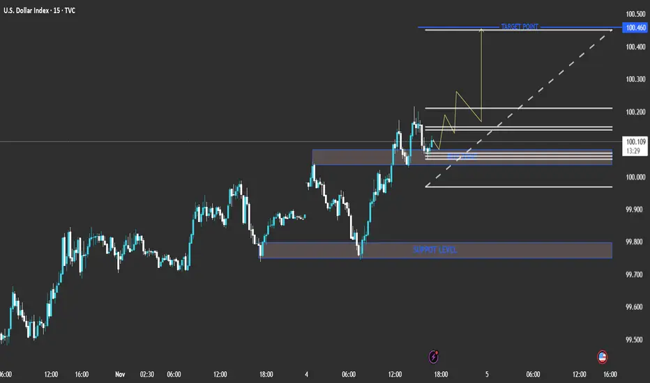 The chart suggests a short-term bullish scenario for DXY (U.S. Dollar Index). A successful bounce from the 100.00 zone could lead to a move toward the 100.46 target point. However, a break below 99.90 would invalidate the setup and shift bias to neutral or bearish.