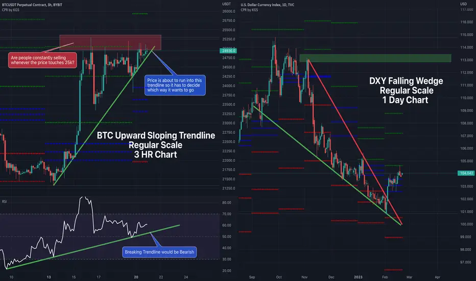 Bitcoin is about to run into this Upward Sloping Trendline on the 3 Hour Chart. The price is either going to 20k or 29k. Since the DXY seems Bullish I think 20k is more likely in my opinion.