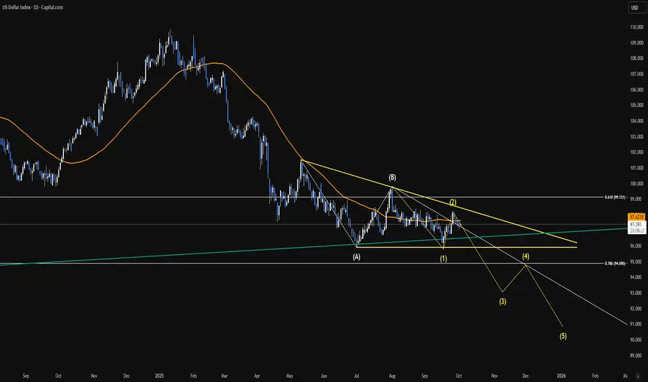 Price has been consolidating within Fibs golden ratio while creating a typically bearish descending triangle, applying Elliot Theory (still learning btw) I find this pattern interesting at the bottom of a HTF bullish channel. With current monetary policy (as I understand it) Trump is intentionally weaking the Dollar to favor USA manufacturing. If this trend continues I believe it´s possible DXY reaches 91.00 levels and potentially keep boosting risk assets and/or gold.