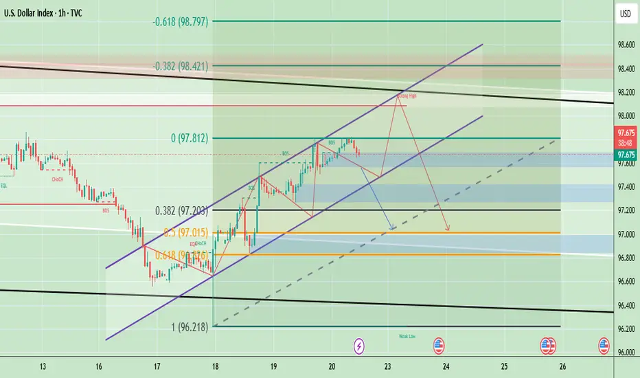 DXY (U.S. Dollar Index) is trading around 97.71, holding within an upward channel after bouncing from the 97.00–97.10 support zone. The structure shows a series of higher highs and higher lows, indicating short-term bullish momentum. However, the chart also highlights a potential “strong high” area near 98.20–98.40, where resistance from both Fibonacci retracement levels and channel tops converge. If DXY fails to break above this resistance, a retracement toward 97.20–97.00 is likely, with further downside risk toward 96.80 if that support breaks.