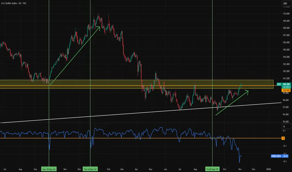 Earlier this week, Logan highlighted the elevated repo rate and noted that the Fed may need to step in and purchase assets if conditions persist. The liquidity shortage is putting upward pressure on the dollar index. A breakout above 101 could accelerate that pressure further.