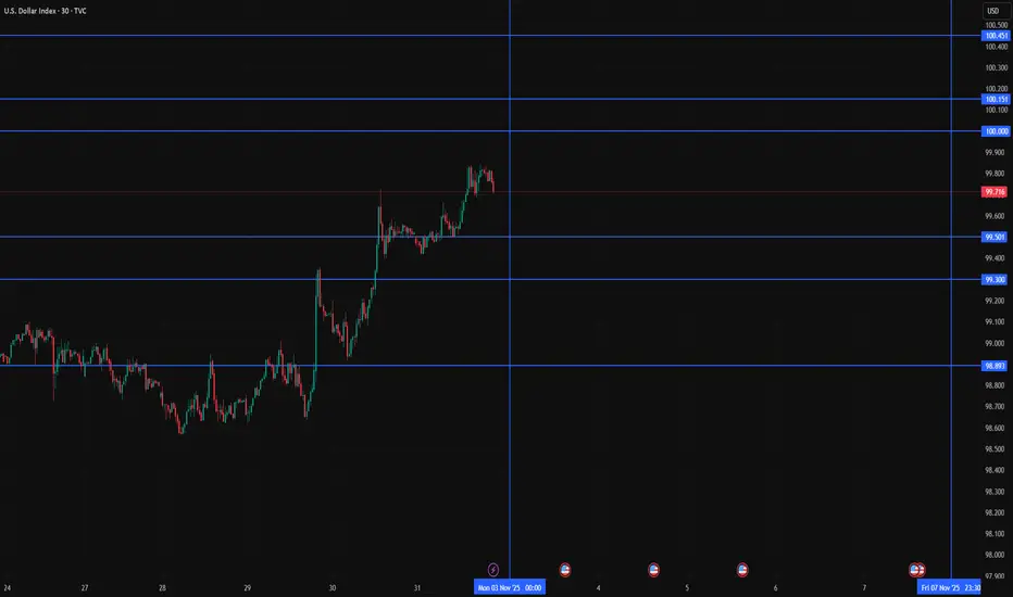 A clean, event aware plan for the Dollar Index for the week ahead. We start the week with DXY holding the ninety nine handle and sitting just below the round one hundred line. The location is the story. Round numbers compress behavior. If you pre mark the right shelves and then trade the reaction to data and auction tone, you can avoid most of the week’s traps while still catching the meaningful moves.