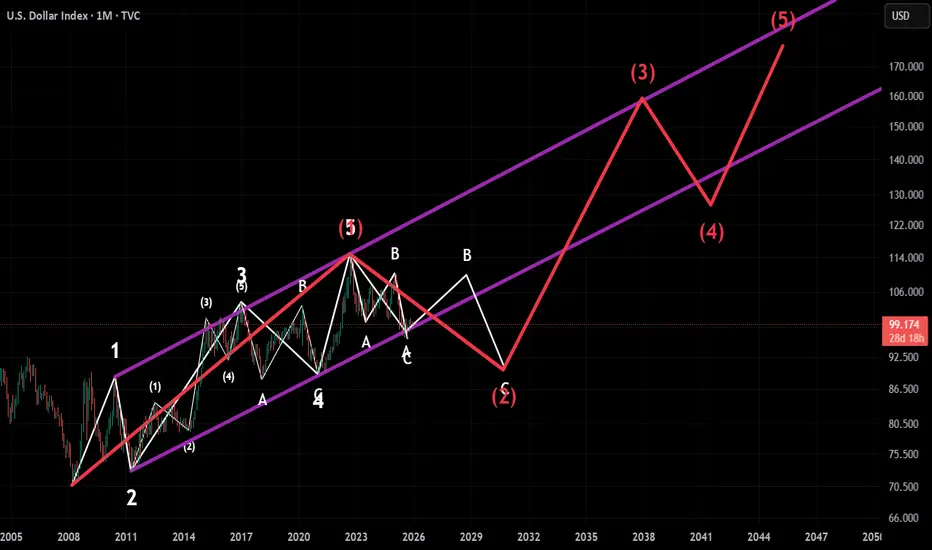 The US Dollar Index continues to follow a clear multi-decade Elliott Wave structure inside a rising purple channel, and the long-term configuration strongly suggests that a major Cycle Wave (1–5) impulse has already completed. The advance began with Wave (1) rising sharply off the long-term base, followed by a deep Wave (2) correction back to channel support. From there, the index entered its strongest bullish phase, producing a powerful Wave (3) rally that pushed price into the upper boundary of the long-term channel. After this expansion, the Dollar consolidated through Wave (4), a prolonged sideways/down correction that held the channel midline, before finally completing the sequence with Wave (5), which tagged the upper channel once more and confirmed a multi-decade cycle top.