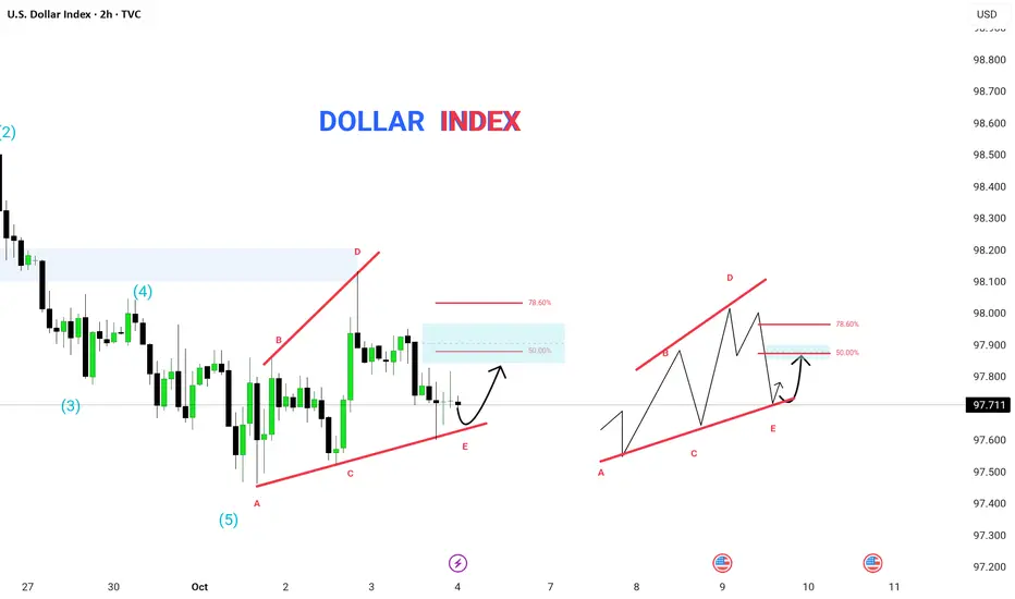 The US Dollar Index (2H timeframe) is currently developing a corrective wedge structure (A–B–C–D–E) following a completed 5-wave bearish impulse. The current price action suggests a potential bullish correction from the E-point.
