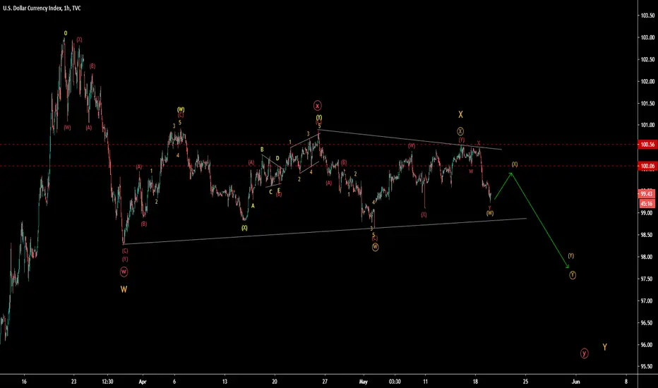 US Dollar (DXY) is in WXY pattern as shown in chart. X wave was bigger complex wave and spent a huge time with almost no price movement. Y wave is subdividing in wxy, where w & x wave are over. y wave is again subdividing as shown in chart as complex correction.